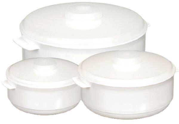 Gastro 3 darab fehér műanyag mikrohullámú sütőbe való edénykészlet fedővel. Tálak 0,5 l, 1 l és 2 l űrtartalommal. Maximális hőmérséklet: +110 °C-ig. Alkalmas ételek melegítésére és tárolására.