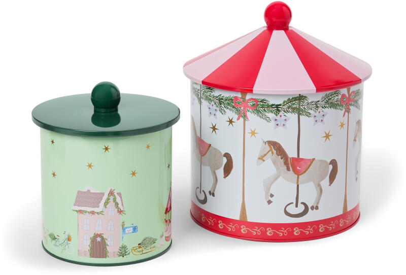 2 db karácsonyi kekszesdoboz Szín: 1x piros karácsonyi mintával, 1x zöld karácsonyi mintával Anyag: Fehérbádog, nyomott mintával Méretek: Nagy Ø: kb. 18 cm, magasság fedéllel: kb. 22 cm Nagy Ø: kb. 13,5 cm, magasság fedéllel: kb. 16 cm Hosszabb ideig tarthatják frissen a süteménytKarácsonyi mintávalHa nincsenek használatban, helytakarékosan egymásba rakhatók. 2 különböző méret a szettben